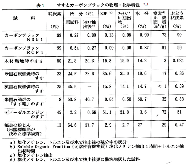 人間活動に伴う煤には、非意図的に生成・排出されるものと意図的に製造される煤(工業製品とする為、管理した条件で製造する煤)が有る(図1参照)。この内、非意図的に排出する煤は、健康に害悪も懸念される灰分・未反応油分及び付着分子等が多い、自動車排ガス・工場煤煙は、この中に含まれる(表1 SOF ソックスレー抽出物)。一方、意図的に製造される煤・カーボンブラック(以後、図1に示すファーネス法・アセチレン法等現在多量に生産されている工業的煤をカーボンブラックと表記する)は、グラファイトと同様な構造を持つ安定した炭素分が主体である(表1純炭素参照)。