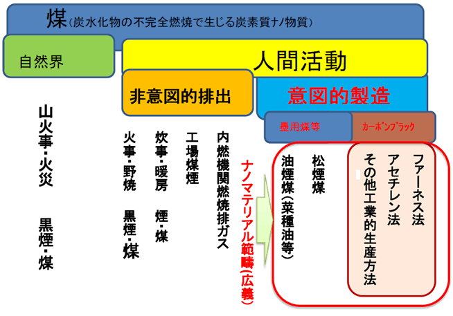 国連の経済協力開発機構(以下OECD)は、『ナノマテリアルとは、意図的に作られる固体で大きさがX,Y,Zのどれかの次元が1~100nmである、またはこれらの凝集体』と定義している。煤においては、図1の意図的に製造される材料がナノマテリアルに分類される。又、OECDは、安全性を調査するスポンサーシッププログラムの代表的ナノ物質(14物質)の一つとしてカーボンブラックを指定した(カーボンブラックは、スポンサー国が無いため、その後調査対象から外された)。